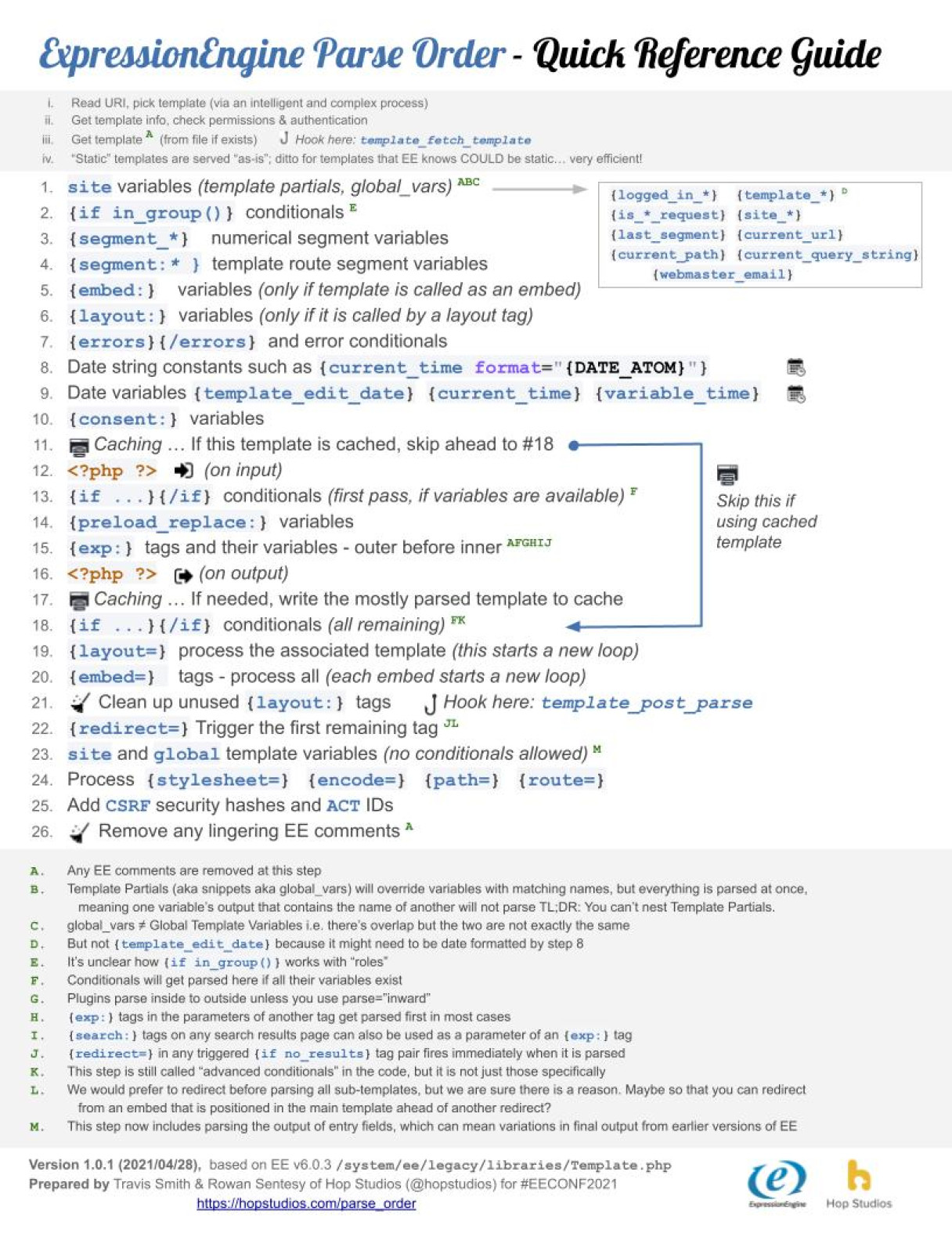 We put together this one-page ExpressionEngine parse order reference guide (version 1.0.1 2021/04/28) for anyone to download and print out.
