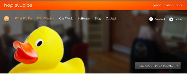 The Hop Studios duck—what is her name, anyway?—is gorgeous. Her perky pose generates interest and the duck’s eyes have a cute angle. But the question was: where should we place our beloved duck? Originally, she was going to be a part of the navigation area, but within our inner pages it was so small (see above) and.. too big (see below).