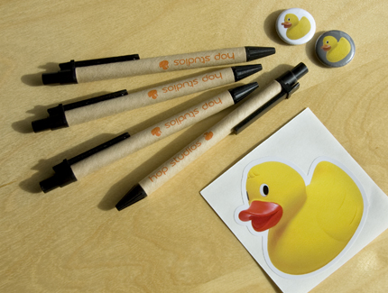The owner of the Saul Good Gift Co. just happens to be Saul Good. He did a fabulous job of keeping me informed about our order along the way and ensured we received the pens in time for the conference despite a tight deadline and an initial error in shipping. As for the pens themselves, I’m very pleased with the look of the Hop Studios branded cardboard pens, and they go nicely with the rest of the conference swag we keep on hand.