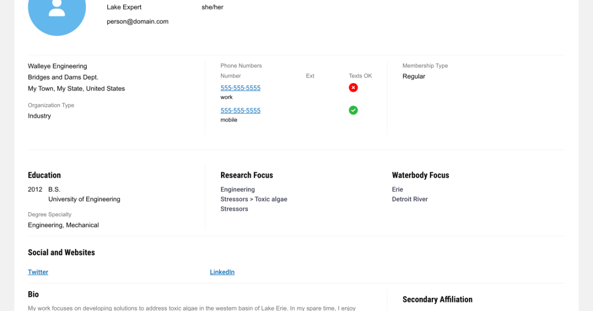 Behind the scenes, IAGLR admins and board members have quick access to yearly reports showing membership type, journal subscriptions, geography, research and waterbody interests, and demographics. Admins can track recent profile edits, download records for offline use, and create announcements, all with custom access levels for security and ease of use.