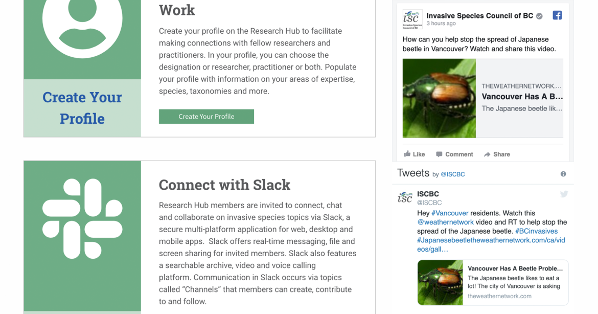 Once the upgrade was complete, ISCBC asked us to design and develop a new Research Hub section of the website, where researchers and practitioners within the invasive species community can connect and collaborate. We were tasked with creating something functional but interesting, while sticking to the same aesthetic found throughout the existing site.