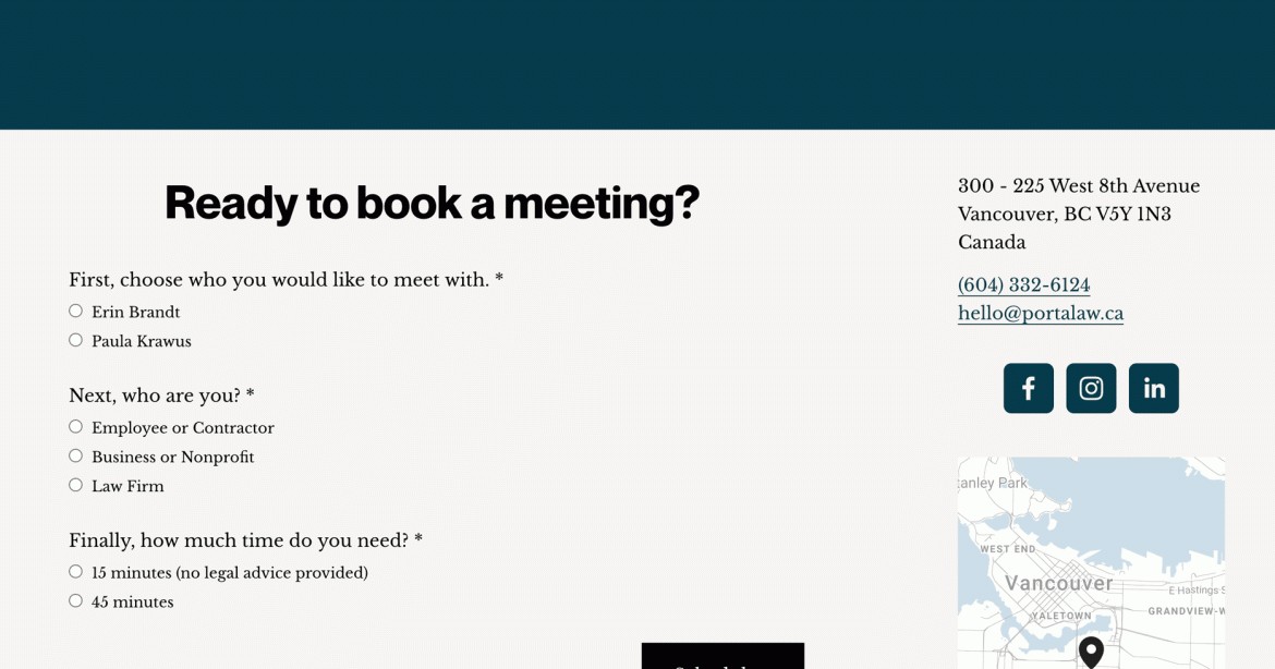 We’re particularly pleased with the custom scheduling functionality we built to route clients who want to book time directly to the proper Clio Scheduling Software booking pages.
