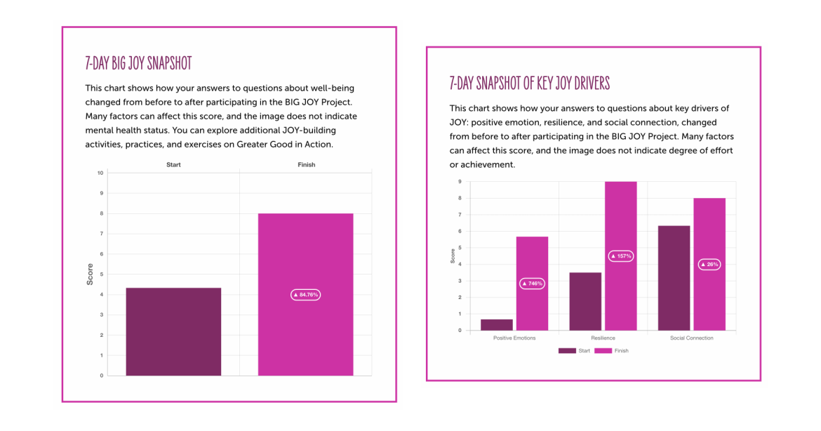 The BIG JOY Project is a real-world mechanism to spread that mission by guiding participants through a free daily 7-minute practice, or micro-act of JOY, for 7 days. In addition to the micro-acts of JOY, participants complete a series of survey questions at the start and end of the week, as well as answering emotion check-in questions before each day’s micro-act of JOY, after completing it, and at the end of the day. After their final micro-act of JOY, their participant survey and check in answers are used to generate a personalized BIG JOY Report that charts key happiness markers from the week. The week-long BIG JOY Project is a springboard that introduces participants to the concept that they have some agency over their own emotional well-being, and provides experiences and tools they can use to influence that well-being.